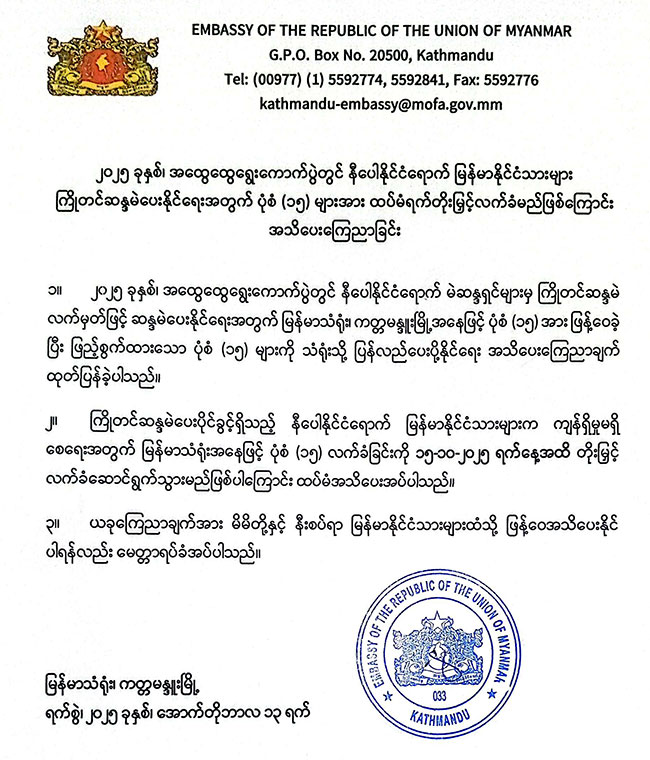 ၂၀၂၅ ခုနှစ်၊ အထွေထွေရွေးကောက်ပွဲတွင် နီပေါနိုင်ငံရောက် မြန်မာနိုင်ငံသားများကြိုတင်ဆန္ဒမဲပေးနိုင်ရေးအတွက် ပုံစံ (၁၅) များအား ထပ်မံရက်တိုးမြှင့်လက်ခံမည်ဖြစ်ကြောင်းအသိပေးကြေညာခြင်း